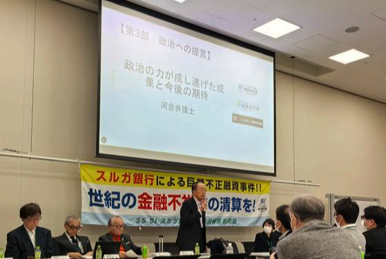 12月15日、「スルガ銀行不正融資被害同盟集会 調停結果の即日報告会」に出席しました。スルガ銀行は不動産会社と結託し、顧客に投資型のアパートやマンションを購入させるため、資産や年収のデータを偽装したり、個人の通帳や家賃表を改ざんしたりするなどの不正を組織的に行っていたとして裁判になりました。この間、金融庁は、投資は自己責任で銀行と債務者の個別の問題だとして、十分な対応をしませんでした。