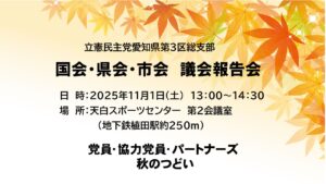 日頃より、党活動へご参加いただき、また、総支部所属の議員をご支援いただきましてありがとうございます。今夏の参議院総選挙におきましては、愛知県選挙区で田島まいこさんが2期目の当選をすることができましたが、全国比例においては議席を伸ばすことができず、改選前と同じ結果となり、党として厳しい総括をしました。